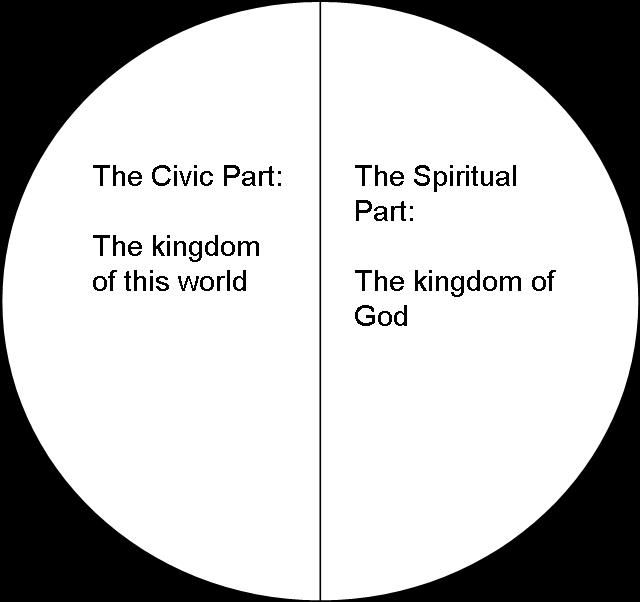 Now sometimes we think these two kingdoms fit together like this: There is one nation, with the kingdom of God as the spiritual half, and with the civic part – the kingdom of this world – as the other half: two halves of a whole.